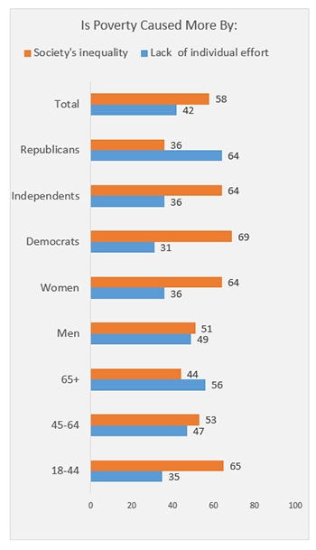 Democrats and independents, liberals and moderates are more inclined to fault society for poverty, while most Republicans and conservatives attribute poverty to the individual. About half of men and nearly two-thirds of women say society is responsible for poverty. Older Americans are more likely to fault the individual, while younger people are more likely to regard poverty as the product of inequity.